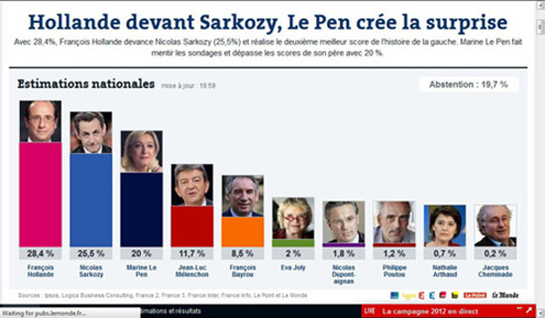 Eredmények (20:00 h) Hollande : 28;40% ; Sarkozy : 25,50% ; Le Pen 20%